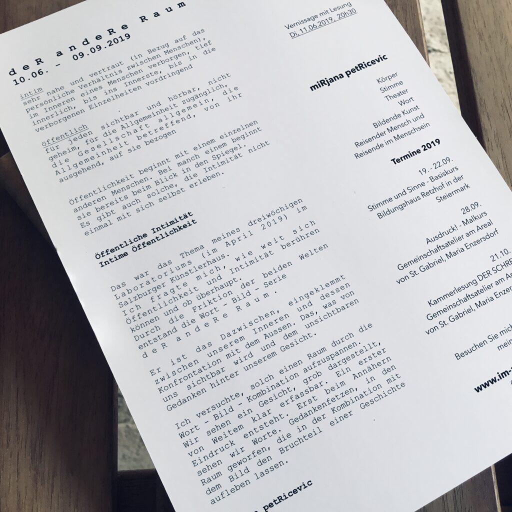 Ich habe ein Innen-Projekt gewählt - auch das geht. Ich habe damit die in den WW2 geöffneten Räume weiter durchschritten und gelüftet. Im Wie ist man ganz fei: mit Hilfe von Videos, Bildern, Objekten usw. - immer mit der Begleitung von Mirjana Petricevic und natürlich der wunderbaren Gruppe. Ich kann es nur empfehlen!